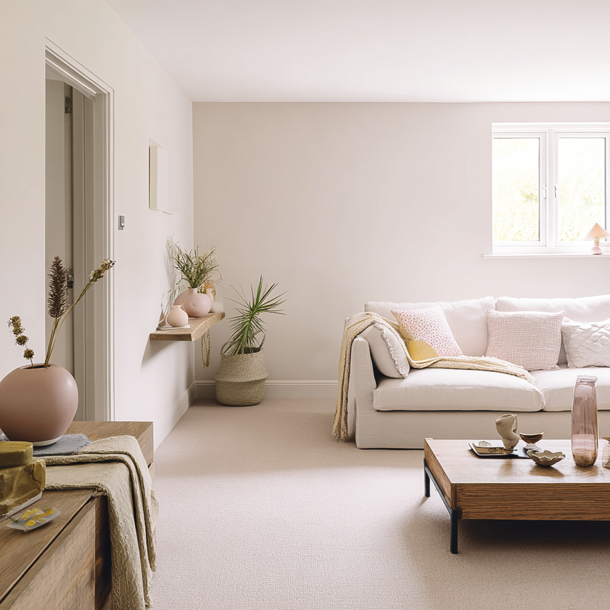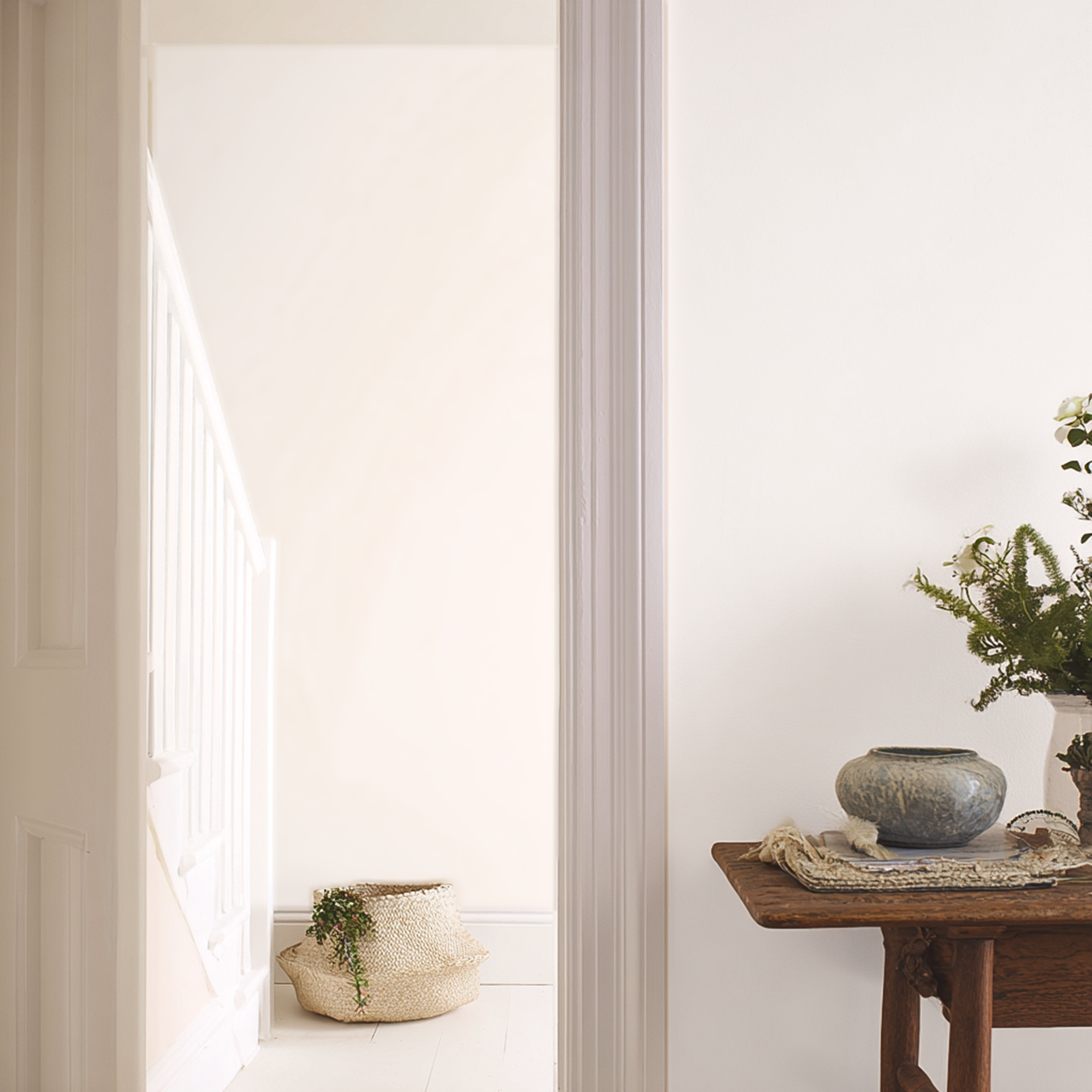 A delicate, soft creamy white with warming peach undertones.