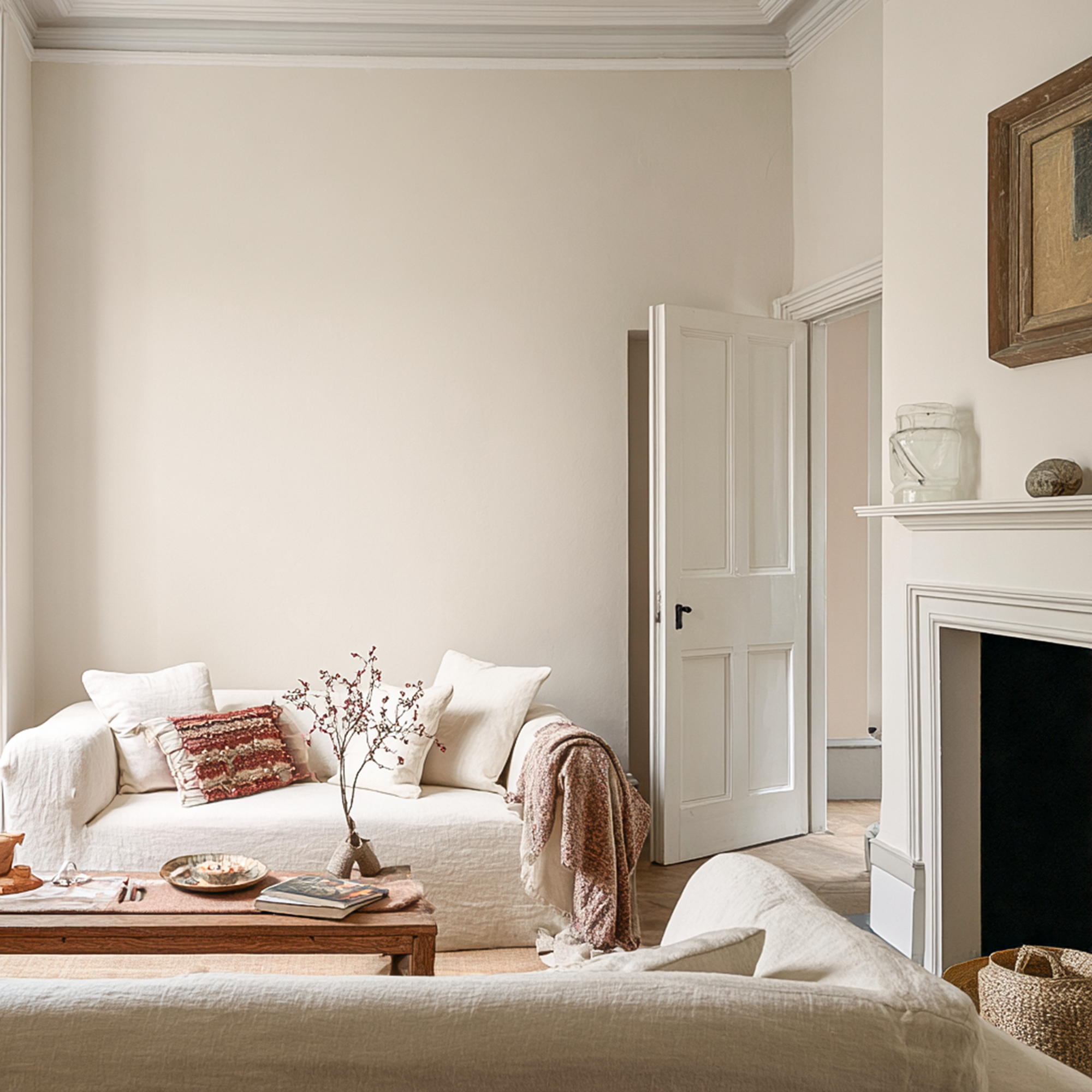 A warming, gentle browny white, capturing the golden essence of wheat fields at harvest time. Like the soft sunlight filtering through the rolling hills, this creamy off-white base is tinged with yellow and earthy beige to create a relaxed and comforting tone.